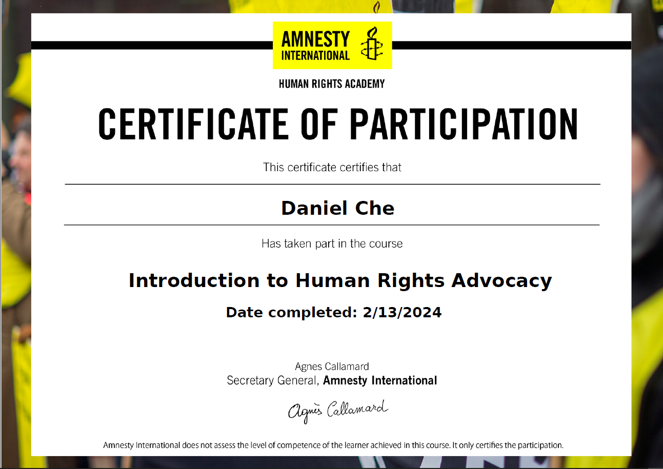 My Amnesty International training has equipped me with a unique blend of ethical insight, advocacy skills, and a global perspective. I am ready to help your organization foster social responsibility, mitigate risks, and create a positive impact on both a local and global scale. Together, we can build a more ethical and just future for your business.